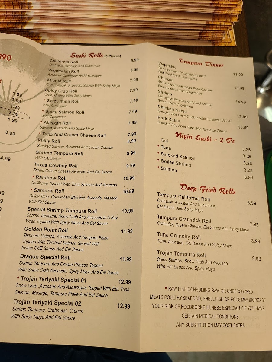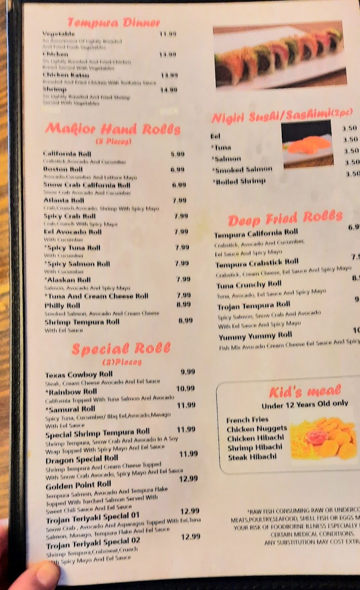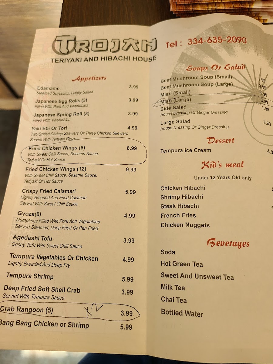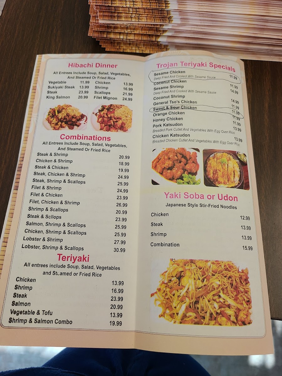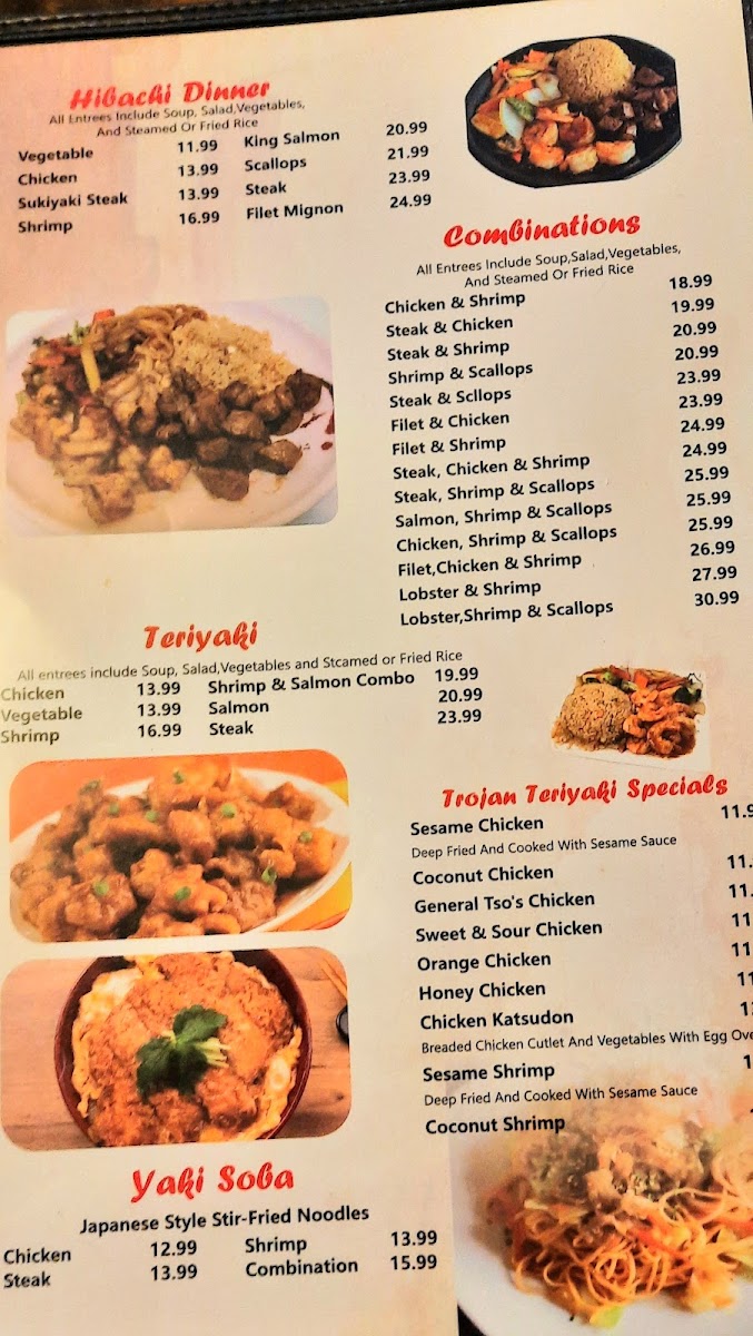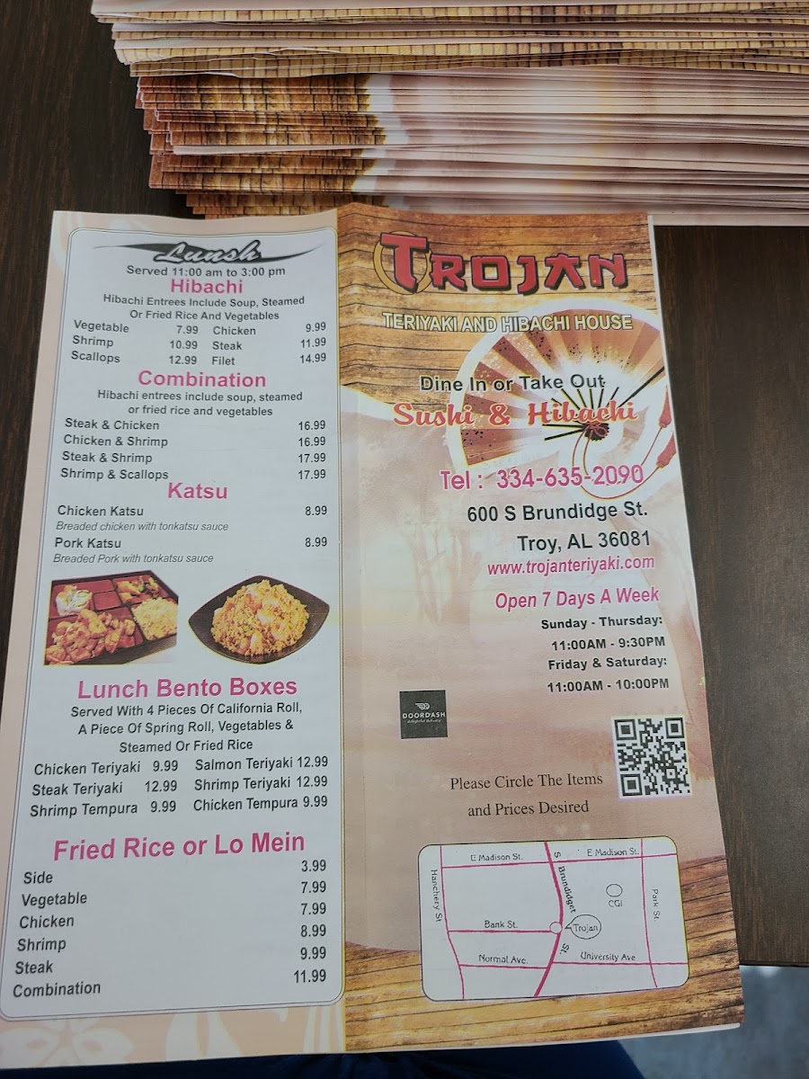 Welcome to the Trojan Teriyaki And Hibachi House Menu, where flavor takes center stage! Nestled in the heart of Troy, Alabama, this local gem offers a variety of mouthwatering dishes that will make every bite a memorable experience. From sizzling hibachi plates to tender, flavorful teriyaki, there’s something for everyone. Each dish is carefully crafted with fresh ingredients, ensuring that every meal is packed with authentic taste. Whether you're craving a hearty meal or a lighter option, the menu features a wide range of choices, including perfectly grilled meats, crisp vegetables, and savory sauces. Pair your meal with a refreshing drink, and you're all set for a satisfying dining experience. The atmosphere is casual and inviting, making it a great spot to enjoy a meal with friends, family, or even on your own.